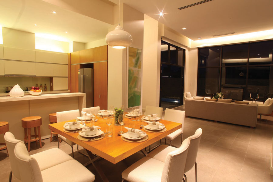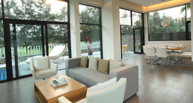 - Phòng khách được thiết kế với các cửa sổ vách kính, không gian thông với sân vườn riêng bên ngoài và phòng bếp bên trong.