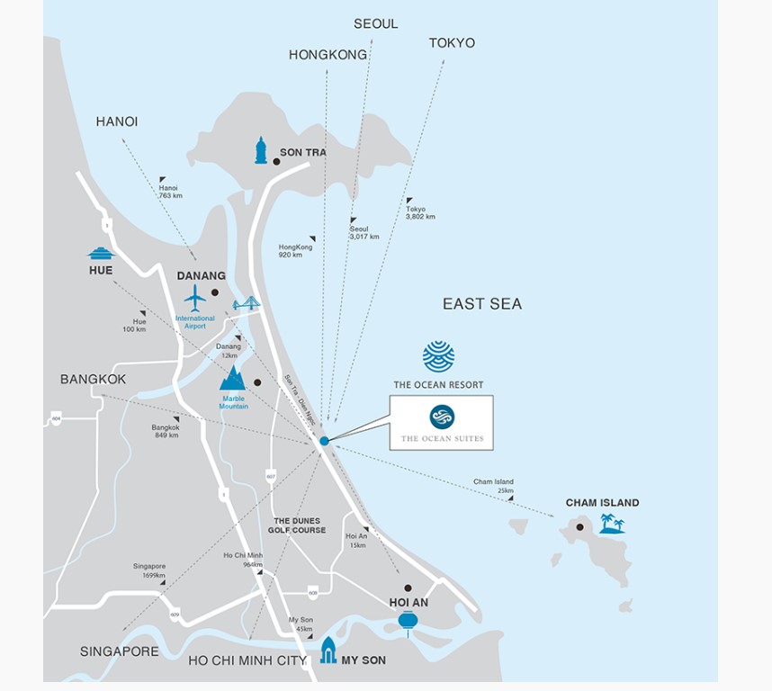 Dự án căn hộ The Ocean Suites tọa lạc trên cung đường 5 sao của thành phố Đà Nẵng, nơi hội tụ nhiều khu nghỉ dưỡng đẳng cấp Quốc tế. The Ocean Suites cách:
