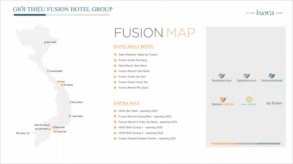 Thương hiệu Fusion Group là một tập đoàn hàng đầu trong quản lý khách sạn. Với chuỗi khu nghỉ dưỡng bao gồm dịch vụ spa và liệu trình trị liệu thư giãn. Fusion không chỉ nổi tiếng ở Việt Nam và còn ở khu vực Đông Nam Á.