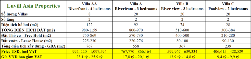 – Phân loại: 68 biệt thự (28 biệt thự mặt tiền sông, 20 biệt thự hướng sông, 20 biệt thự hướng bể bơi) + 56 phòng khách sạn + 31 phòng Loft (studio cao cấp)