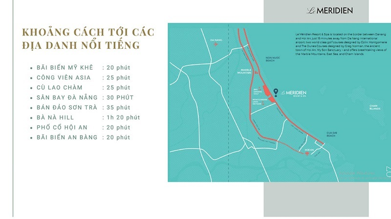 Ưu điểm dự án Le Méridien Danang là chỉ cách các điểm du lịch nổi tiếng chưa đầy 1 tiếng đi xe như: The Ocean Resort Danang, Cocco Bay Da Nang, Sheraton Grand Danang Resort,… cùng chuỗi tiện ích nghỉ dưỡng của những địa điểm du lịch, nghỉ dưỡng nổi bật khác chỉ cách dự án trong vòng 3 km. Nhờ ưu điểm dự án Le Méridien Danang này mà trải nghiệm du lịch của quý khách hàng sẽ càng trọn vẹn hơn nữa.