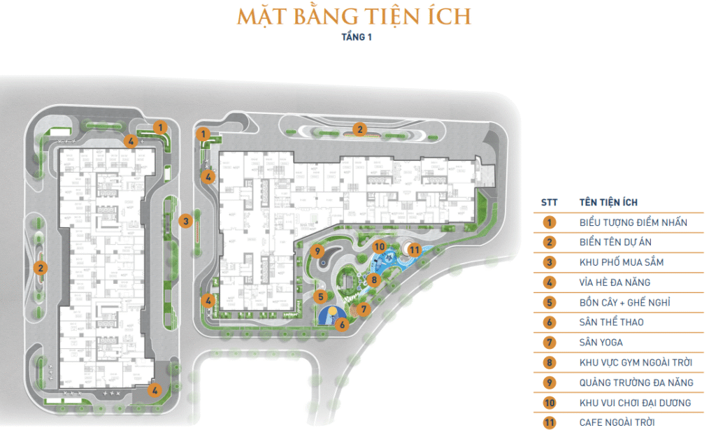 | Tiện ích | Khối đế thương mại, nhà trẻ, khu cây xanh, khu vực công cộng, bể bơi, sân vườn cảnh quan, thư viện, phòng chiếu, Bar + Café, nhà hàng….. |