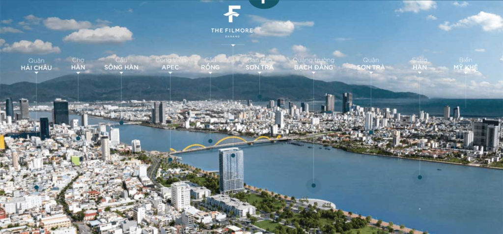 Vị thế The Filmore Danang đắc địa bởi tầm nhìn đắt giá ra trung tâm thành phố và những biểu tượng số một của thành phố Đà Nẵng như sông Hàn, cầu Rồng, cầu Trần Thị Lý, cầu Thuận Phước,…